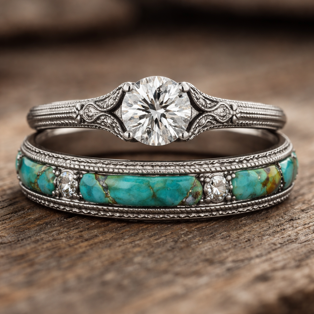 Rustic antique platinum round solitaire engagement ring with a platinum rustic antique turquoise wedding band