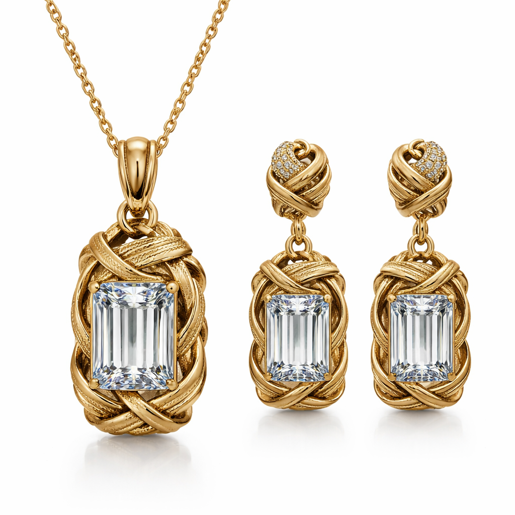Create pendant and earrings in gold with emerald cut diamonds, with leather design in gold, modern style