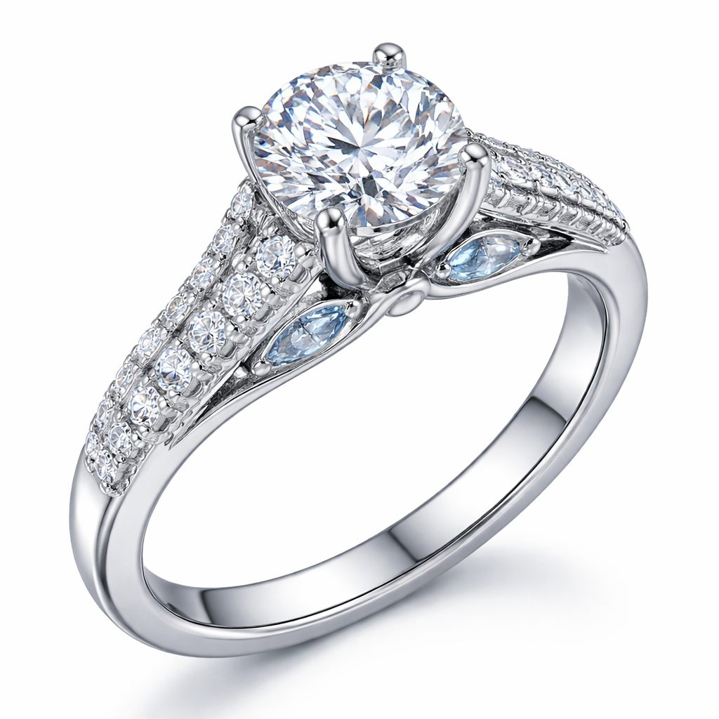 platinum, round diamond with smaller ones on the band, in a cathedral setting, guard rail, light blue sapphire peakaboo