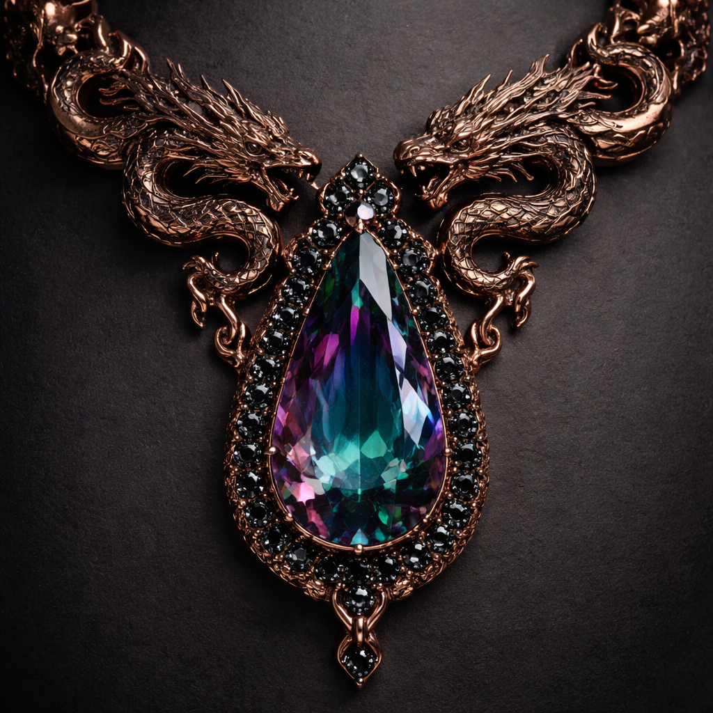 A dark rich rose gold necklace with a skinny teardrop shaped alexandrite in it with black diamond surroundings and dragon carved gold , gemstone style