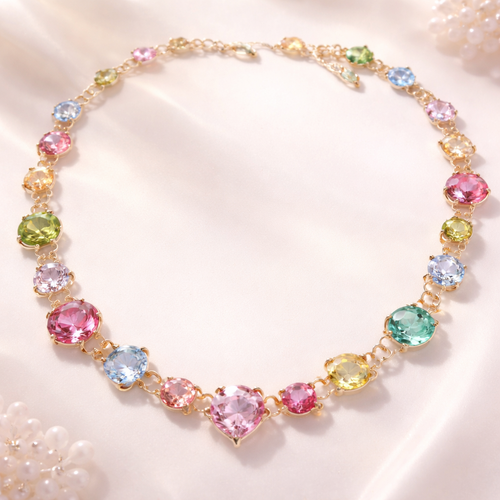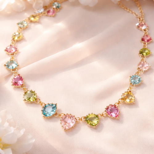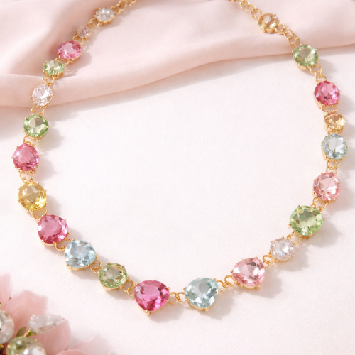 Gold prong set Gemstone necklace. Gems are different sizes and the colors are light pink, hot pink, blue, light green, a...