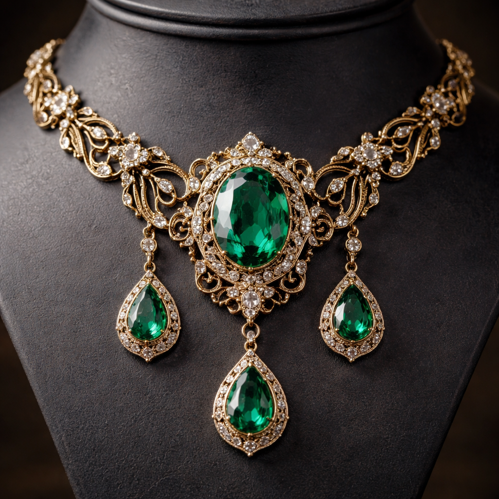 Gem stone necklace on a gold chain. Gem stones are connected by the chain and are different shapes and colors are light ...