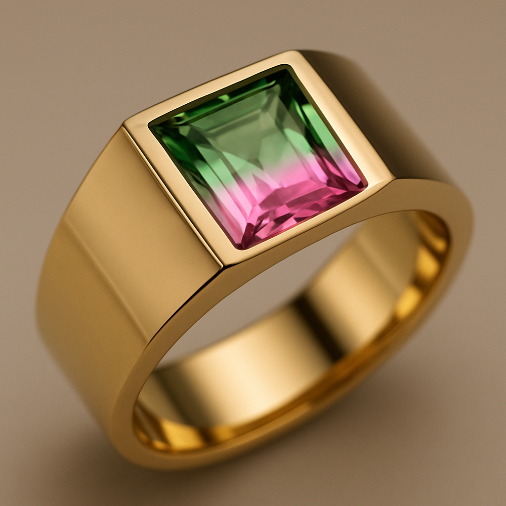 Eckiger Ring 1cm breit mit einem Diamanten in Form eines Trapez in grün und rosa , luxury style