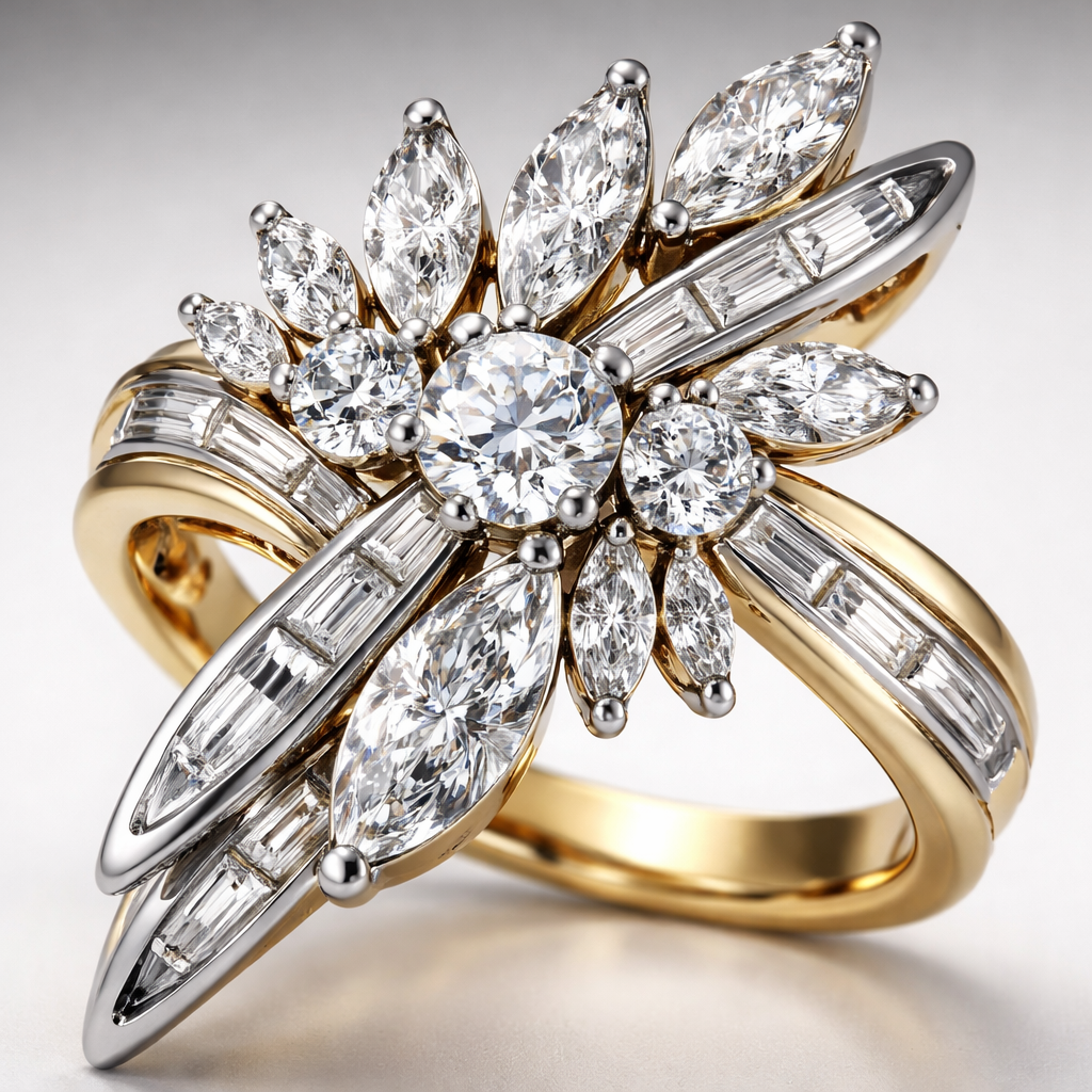 Create a ring with 3 round diamonds the largest being .25 , 7 marquise diamonds with the largest being.6 , several baguettes on yellow gold set in platinum , avant_garde style