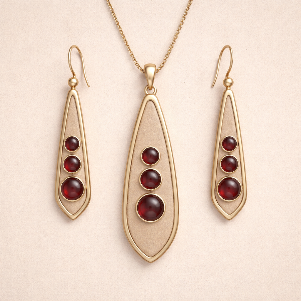 Create minimalistic pendant and earrings with beige leather design and few cabochon garnets , minimalist style