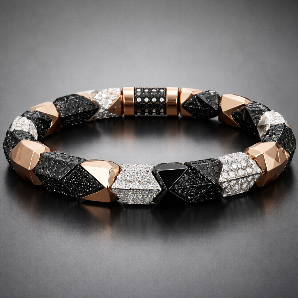 Geomatric edgy angles bracelet of beads for men with black and white diamonds diamonds and rose gold