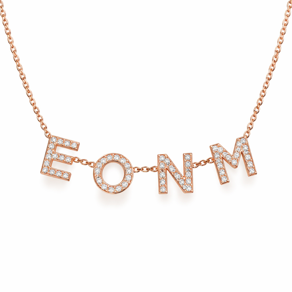 אני רוצה שרשרת קלאסית ודקה בצבע רוז גולד, בשילוב האותיות באנגלית E,O,N,M שהאותיות יהיו מולחמות מהצדדים בצורה אסתטית, משובצות ביהלומים קטנים ועדינים ושיהיה רווח של 2 ס״מ בין אות לאות