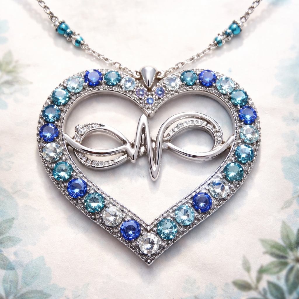A heart necklace with the infinity symbol and heartbeat wave with alternating September, December and March birthstones all the way around the heart and infinity symbol
