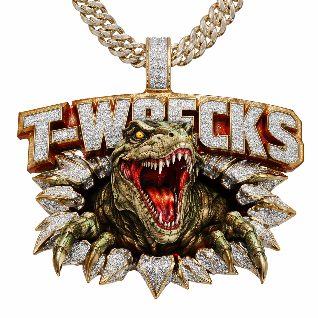 A pendent that says t-wrecks with a t wrecks bursting out the middle of it