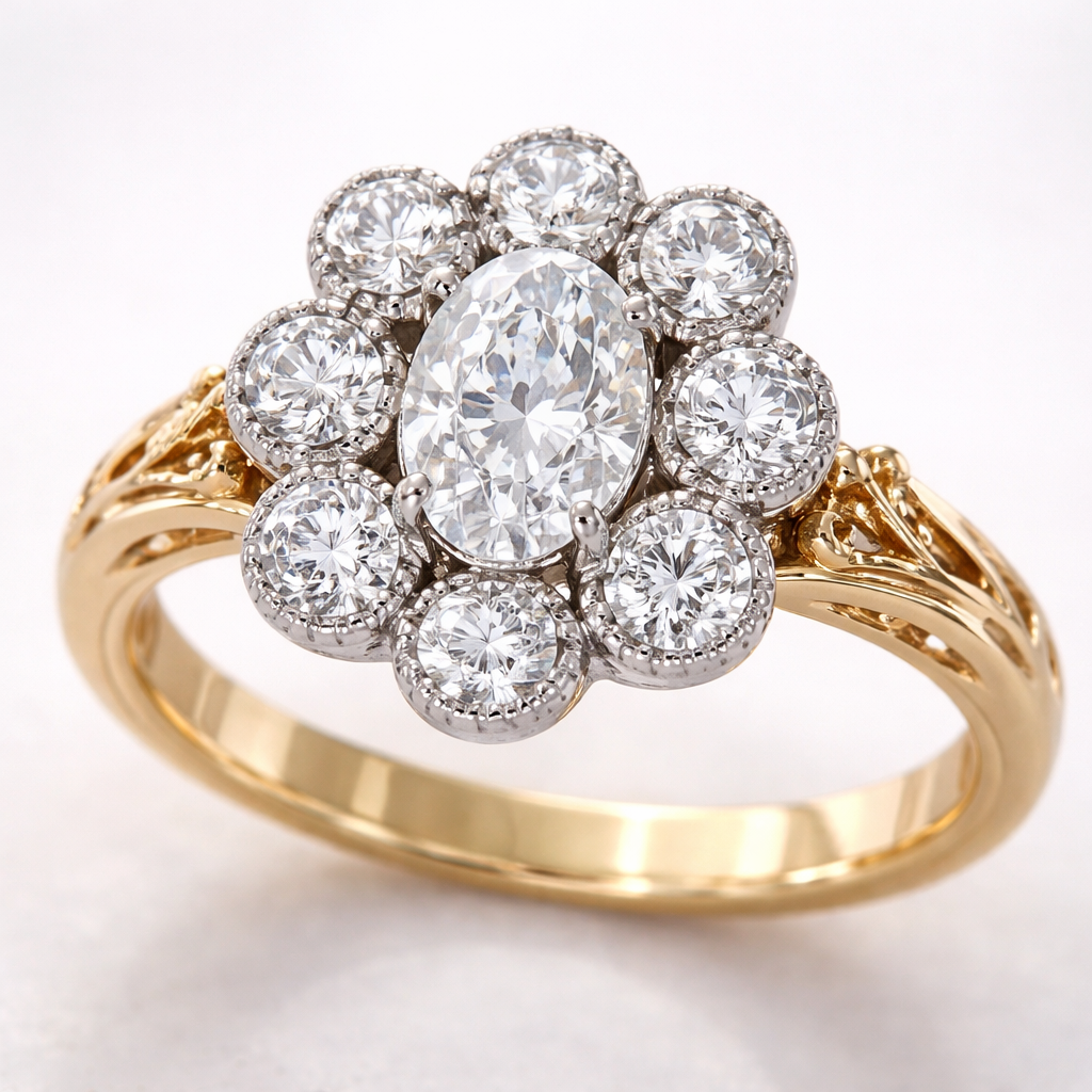 Create a flower style ring with the center stone being an oval three-quarter carat with large round stones, creating the look of a flower around the perimeter of the oval set the diamonds in platinum on a 14 yellow karat gold band the Centerstone has to be an oval, not a round, please make the center stone, a three-quarter carat oval leave space between the large round diamonds that create the flower halo and do eight stones, even if there is some space between them, filigree style