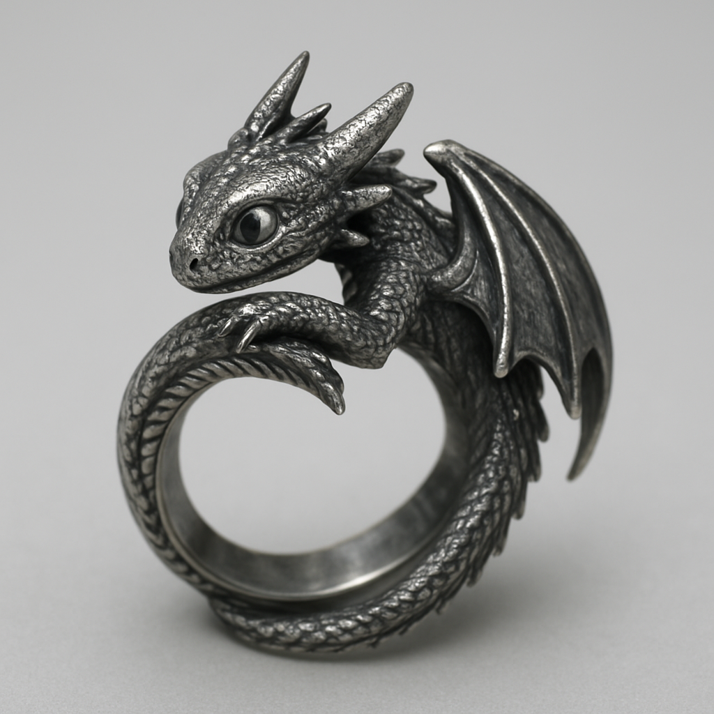 erstelle einen Ring inspiriert von Ohnezahn aus drachen zähmen leicht gemacht. der ring soll silber sein und so aussehen als würde sich der drache um den finger wickeln.