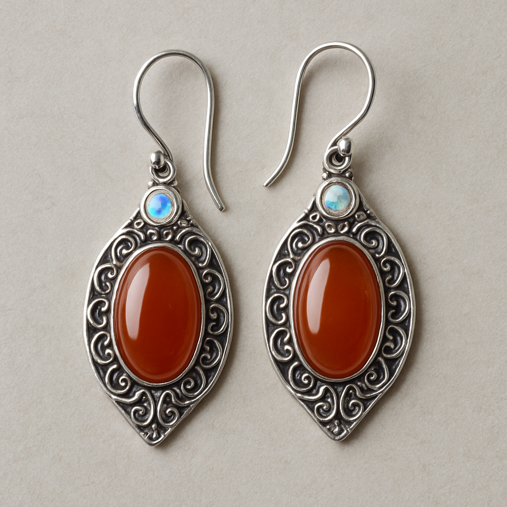 Carnelian oval stone, silver earrings with round opal accent, filigree style
