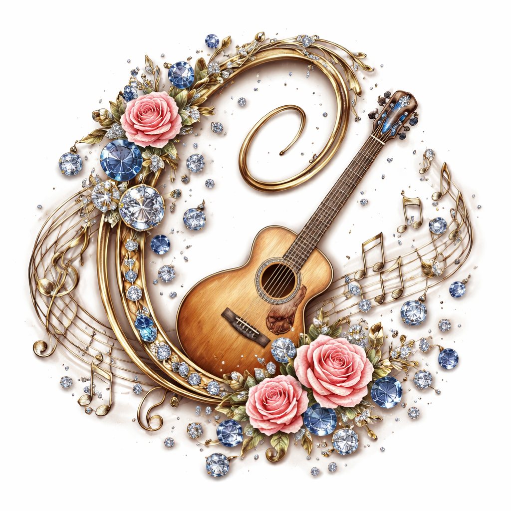 The letter C ave in calligraphy with a guitar with the music note and a stream of music notes and small roses diamonds blue sapphires , vintage style