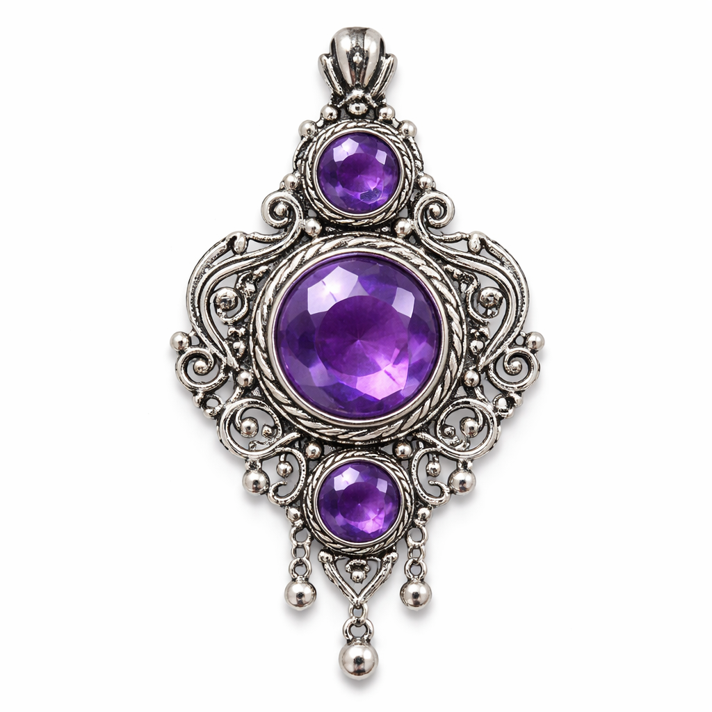 Three round amethyst gems, two small and one larger gemstones in a silver pendant