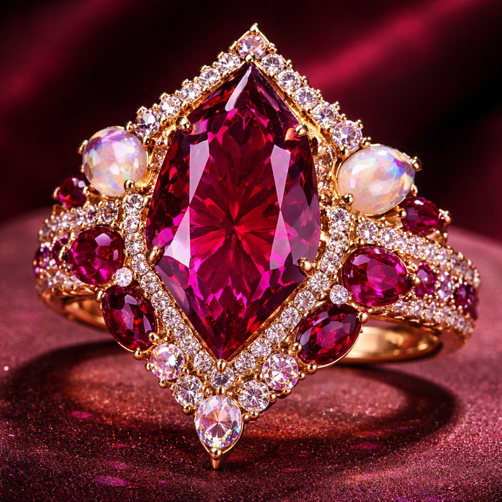A luxury women's ring made of gold with ruby and diamond and opal and garnet stones suitable for engagement. create a baddie bougie style luxurious ring with those stones make it like a wow statement ring. unique facet for the main stone. I really like the maroon colors pink red light pink hot pink all the different types of maroon colors and Plum colors there are