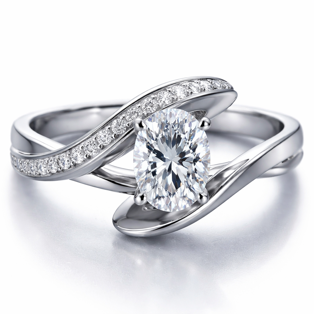 Yellow gold engagement ring with an oval diamond in the center and either a design or diamonds on the band