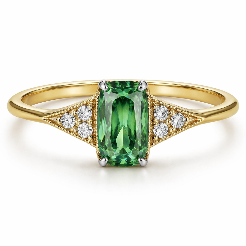 Show me a design for A yellow gold 18 carat very thin band with a sharp angled edge ring. Central green sapphire in a n elongated cushion cut. Either side of the central sapphire are three very small diamonds on each side in a triangle formation with a bevelled edge border. The profile of the stones are raised higher with a bridge off the ring to accommodate a round wedding band underneath. All stones are held in place by four platinum pointy prongs.