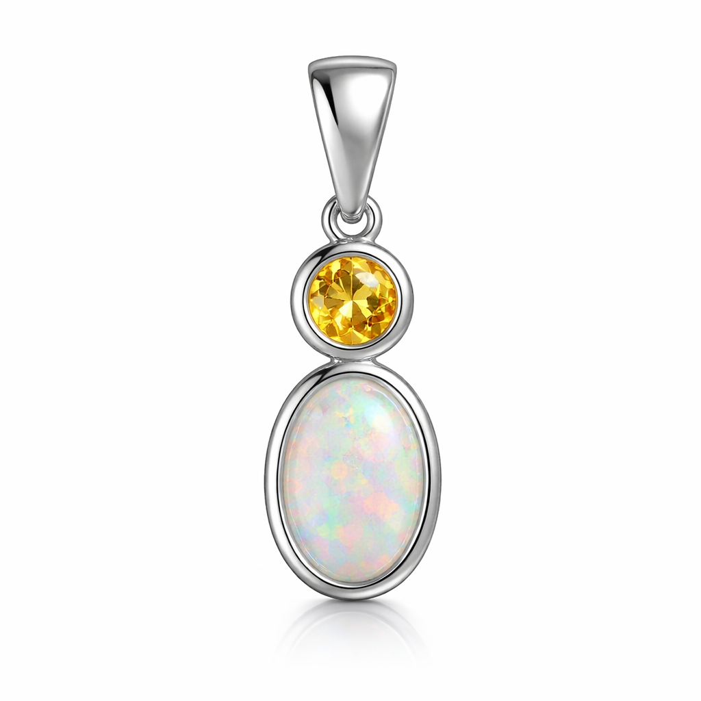 Round citrine and oval opal bezel set in a silver pendant, minimalist style