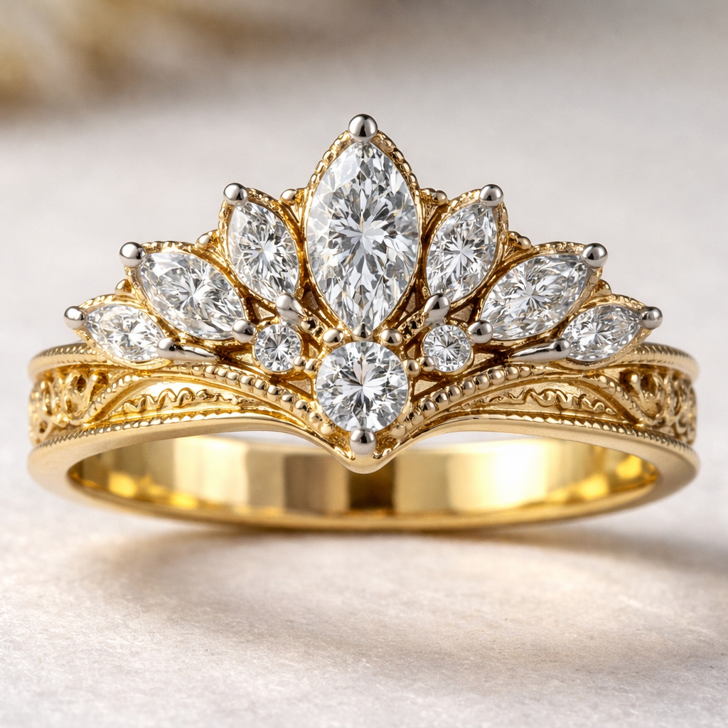 .6 karat marquise centered, with .25 round directly under it with 6 more smaller marquise diamonds and 2 .15 round diamonds mounted on a wide 14k yellow gold band. Make the design in a fan shape and use platinum prongs