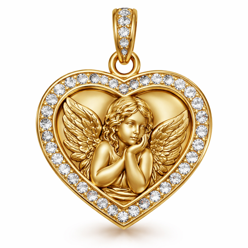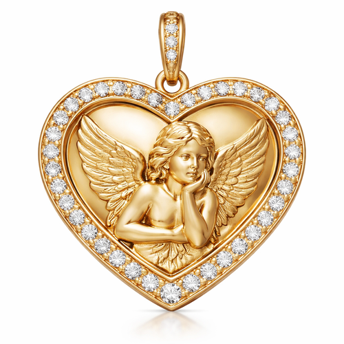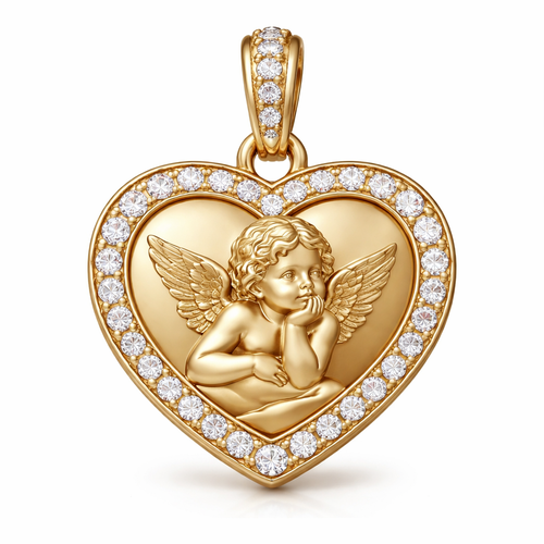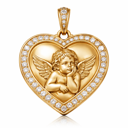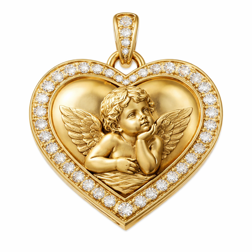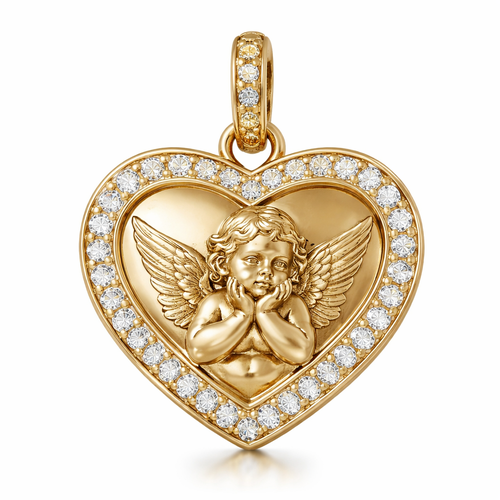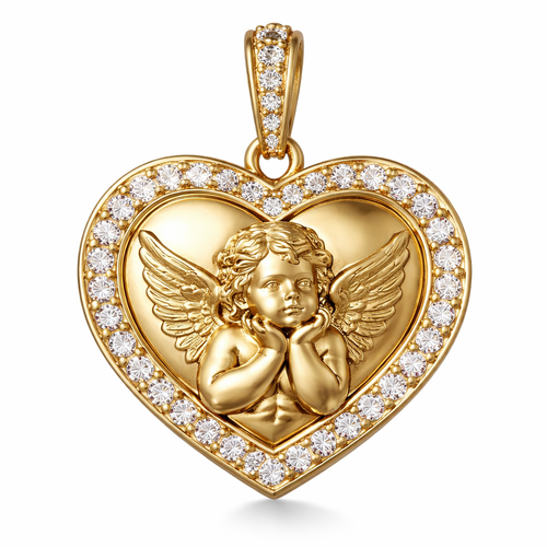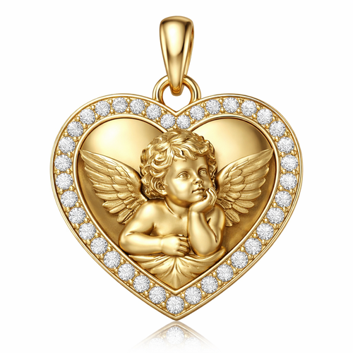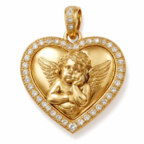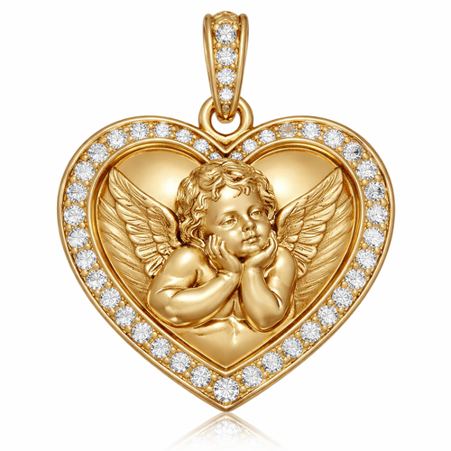 Gold heart pendant with close up guardian angel cherub on surface and Pavé diamond border around heart, gold bale