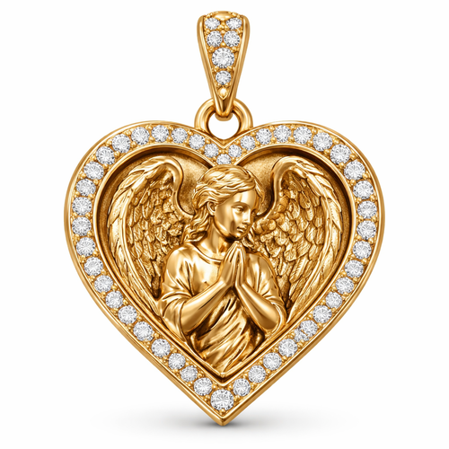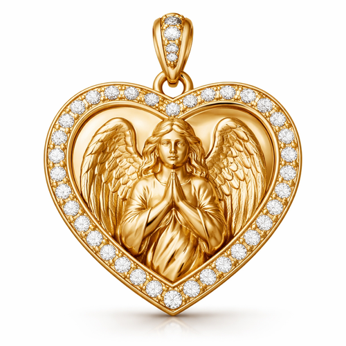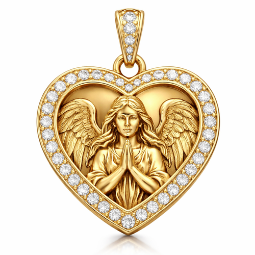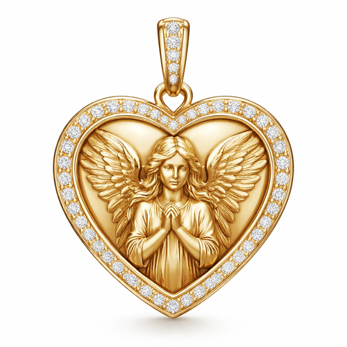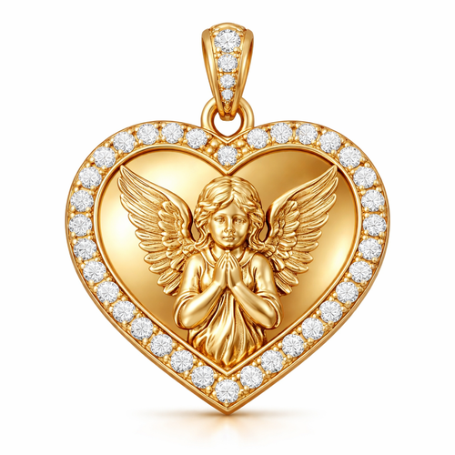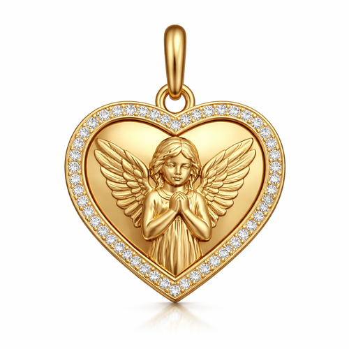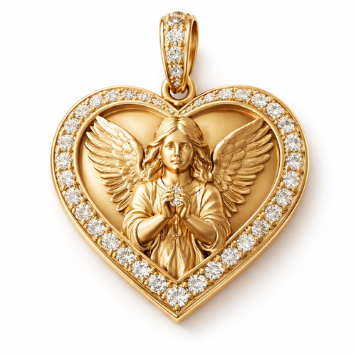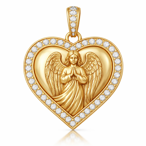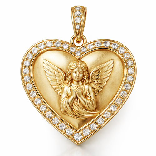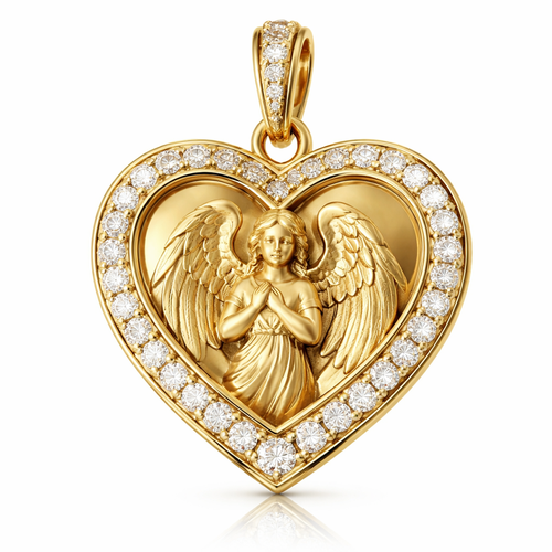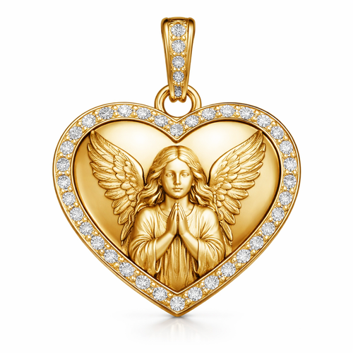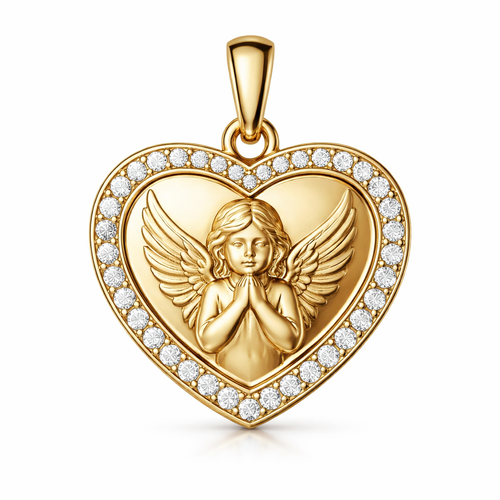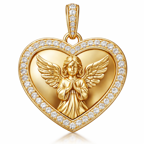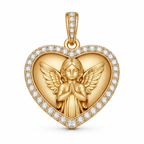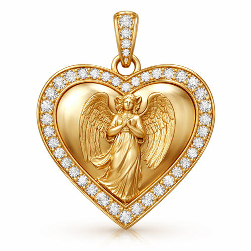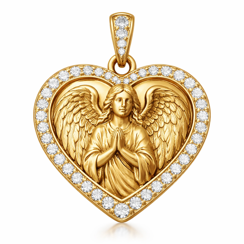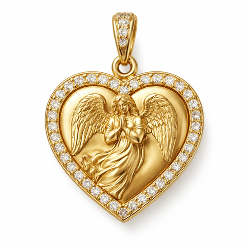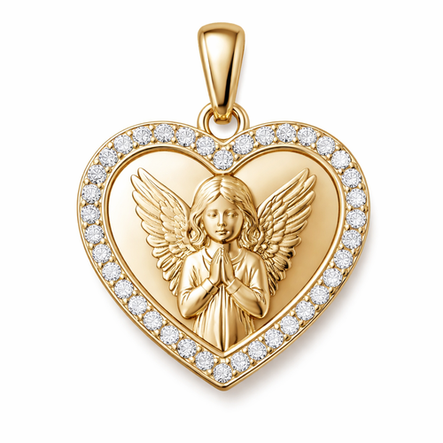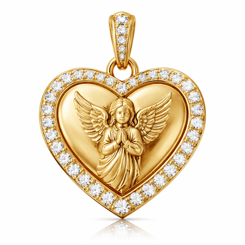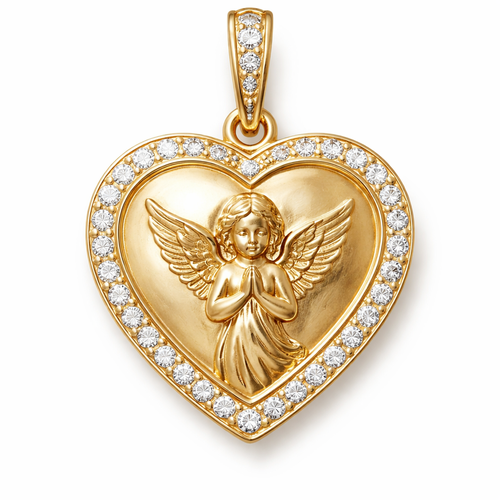 Gold heart pendant with guardian angel on surface and Pavé diamond border around heart, gold bale