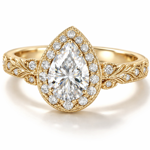 Yellow gold engagement ring with pear shaped diamond and either a design or diamonds on the band