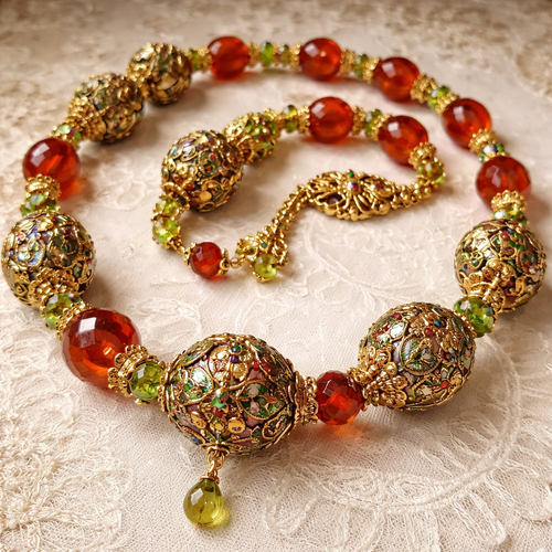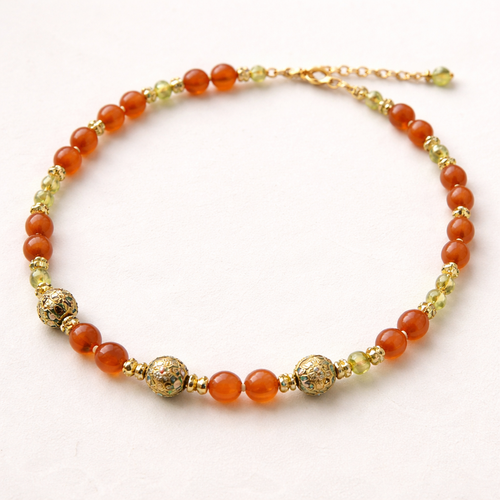 Carnelian beads golden cloisonné beads and peridot beaded necklace with gold findings