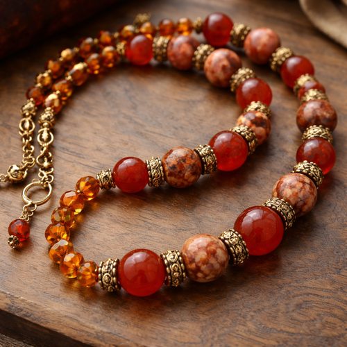 "Carnelian beads red vein Jasper beads with orange Czech glass beaded necklace with gold findings necklace "