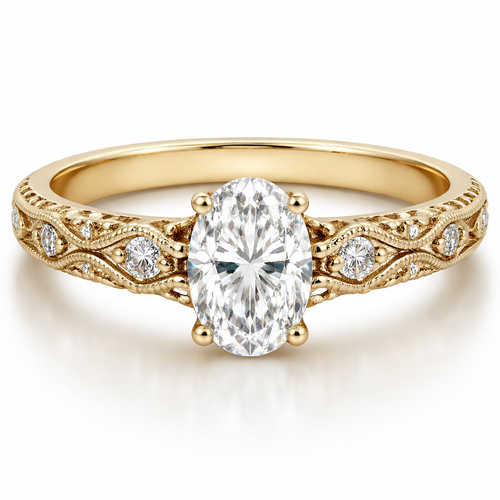 Yellow gold engagement ring with an oval diamond in the center and either a design or diamonds on the band