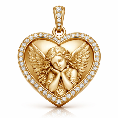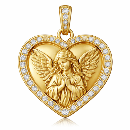 Gold heart pendant with close up guardian angel on surface and Pavé diamond border around heart, gold bale