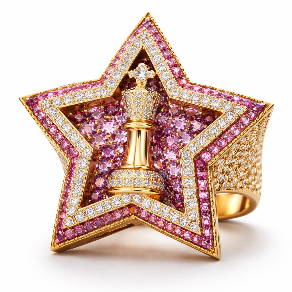 I want a big pinky ring in a star shape with the middle being a chess piece king