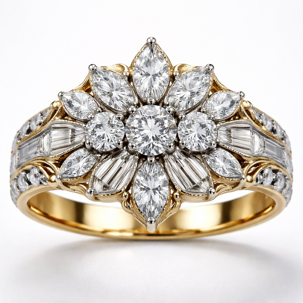 Create a ring with 3 round diamonds the largest being .25 , 7 marquise diamonds with the largest being.6 , several baguettes on yellow gold set in platinum , victorian style