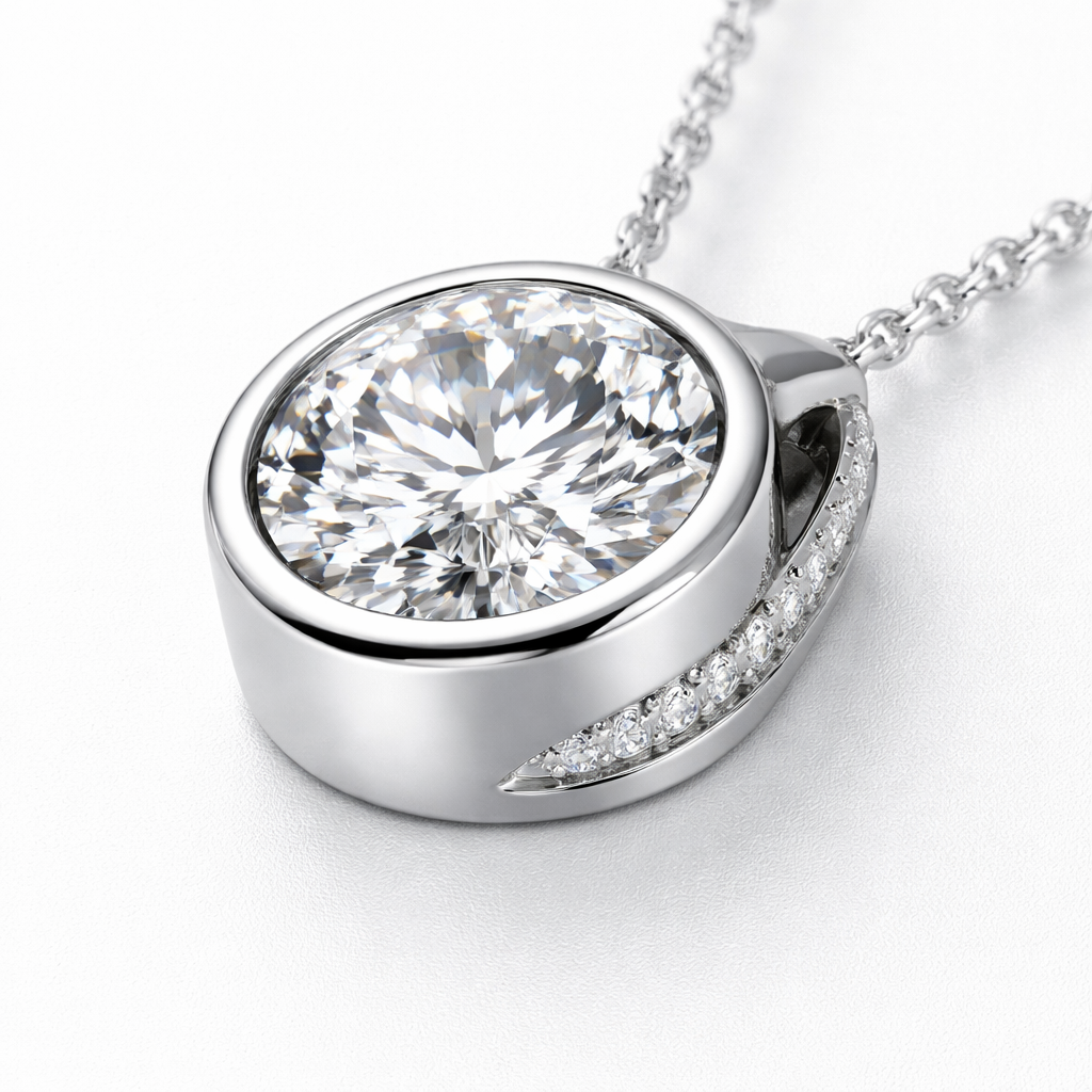 Solitaire diamond pendant with a hidden bail the diamond set in a white gold bezel with a pave diamond hidden halo in the side of the gold bezel hidden bail