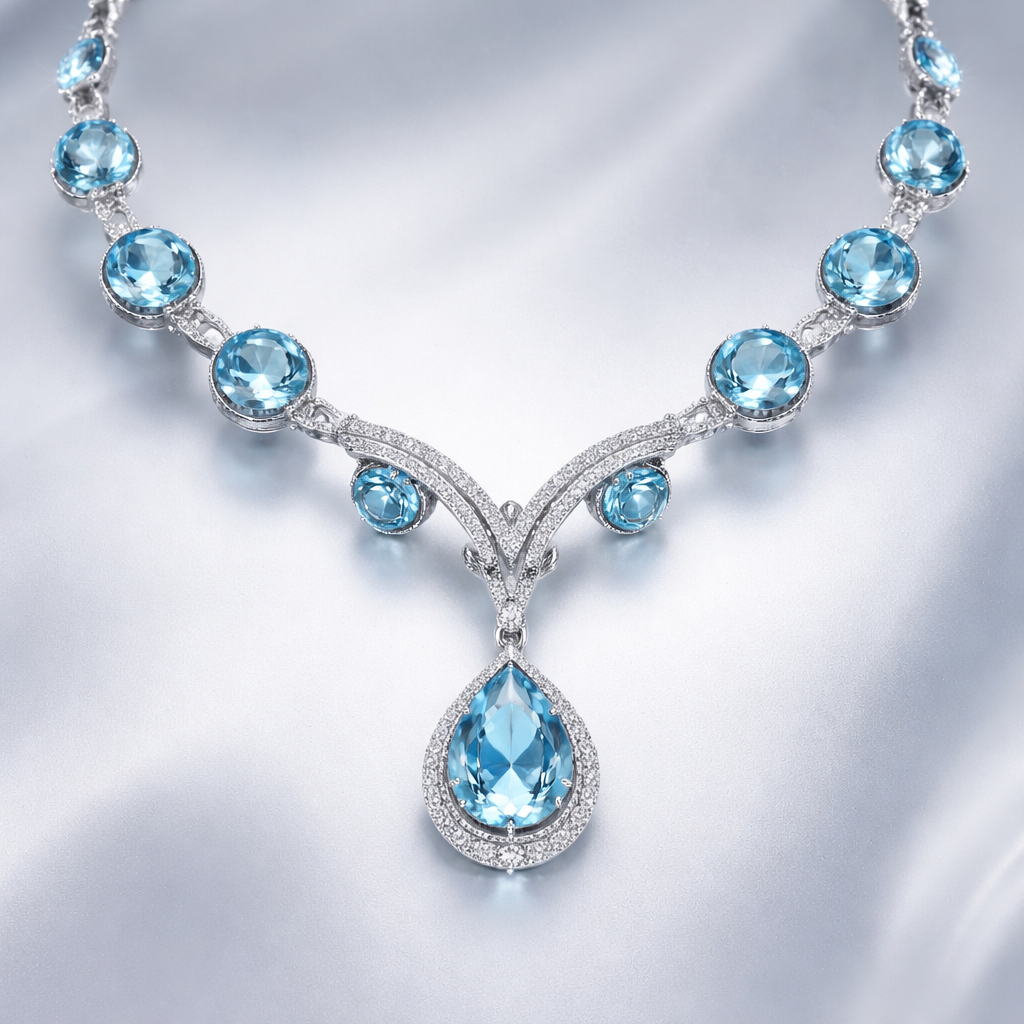 A women's ring. diamond necklace with blue marbles, modern style