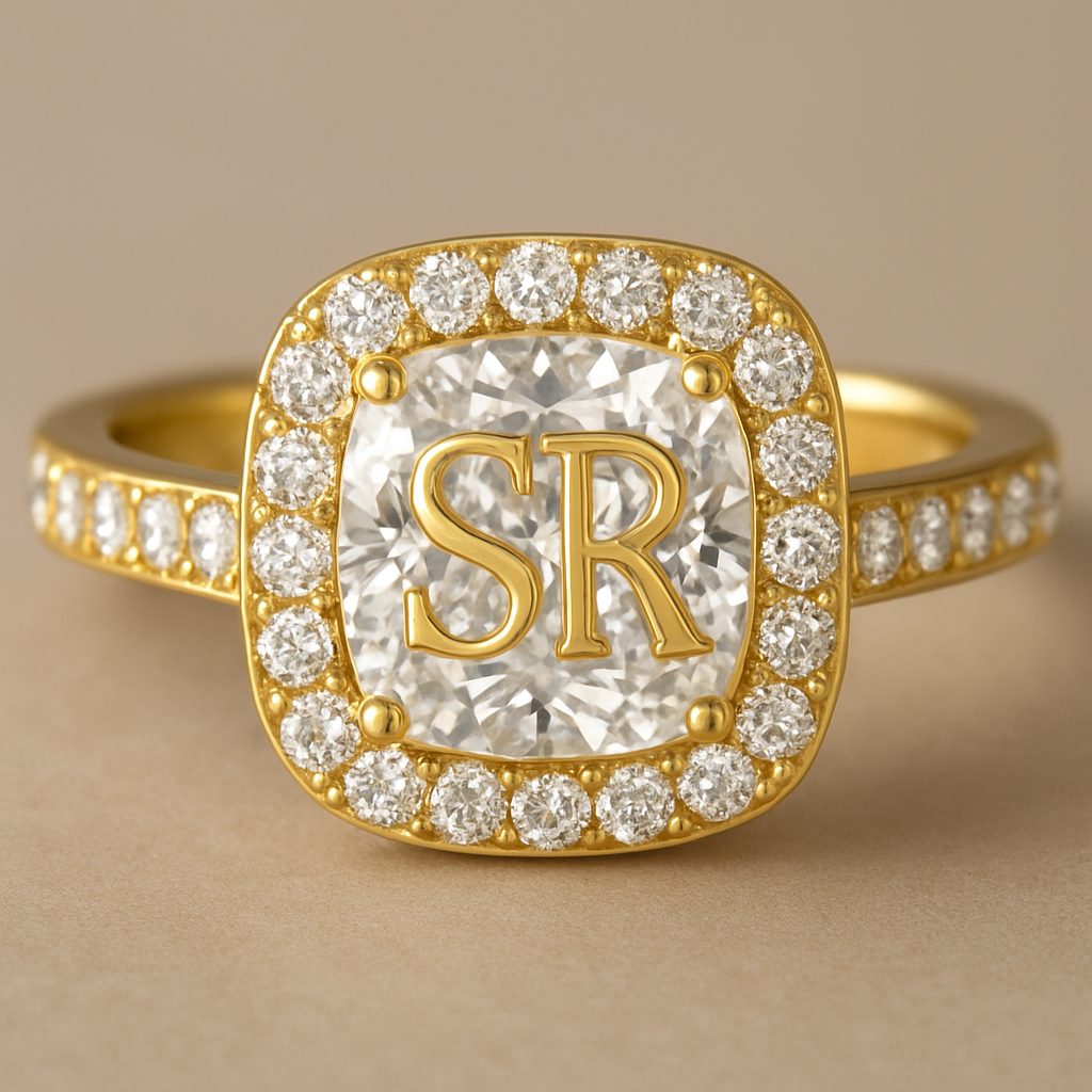Cushion shape with diamonds centre of the ring with letter SR and side of the ring stones, luxury style
