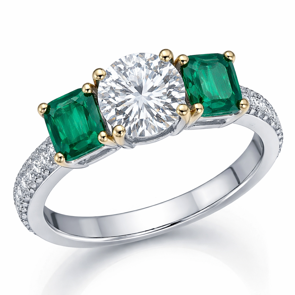Wedding ring with 3 stones a diamond and two emeralds. Small diamonds around the band , contemporary style