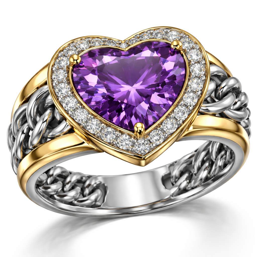 A women's ring. amethyst heart gem surrounded by diamonds, with gold outer edges and steel chain., modern style