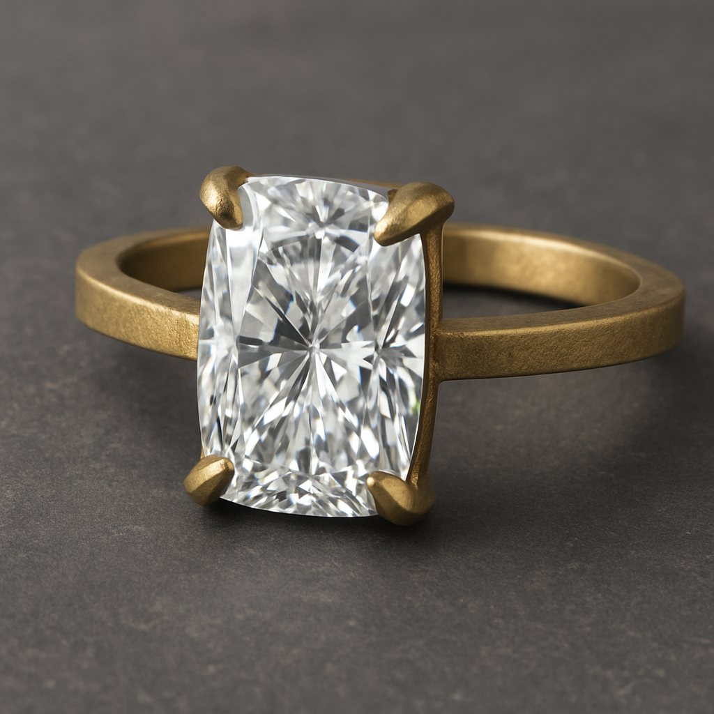 Elongated cushion, cut diamond set in yellow gold band, taping with Talon prongs, industrial style