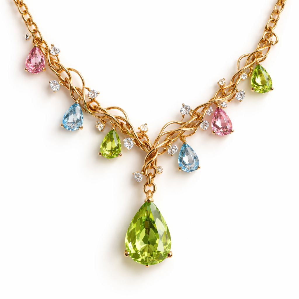 Gold chain with wire wrapped around it like a vine and pear cut peridot, pink and light blue sapphire stones placed throughout the chain