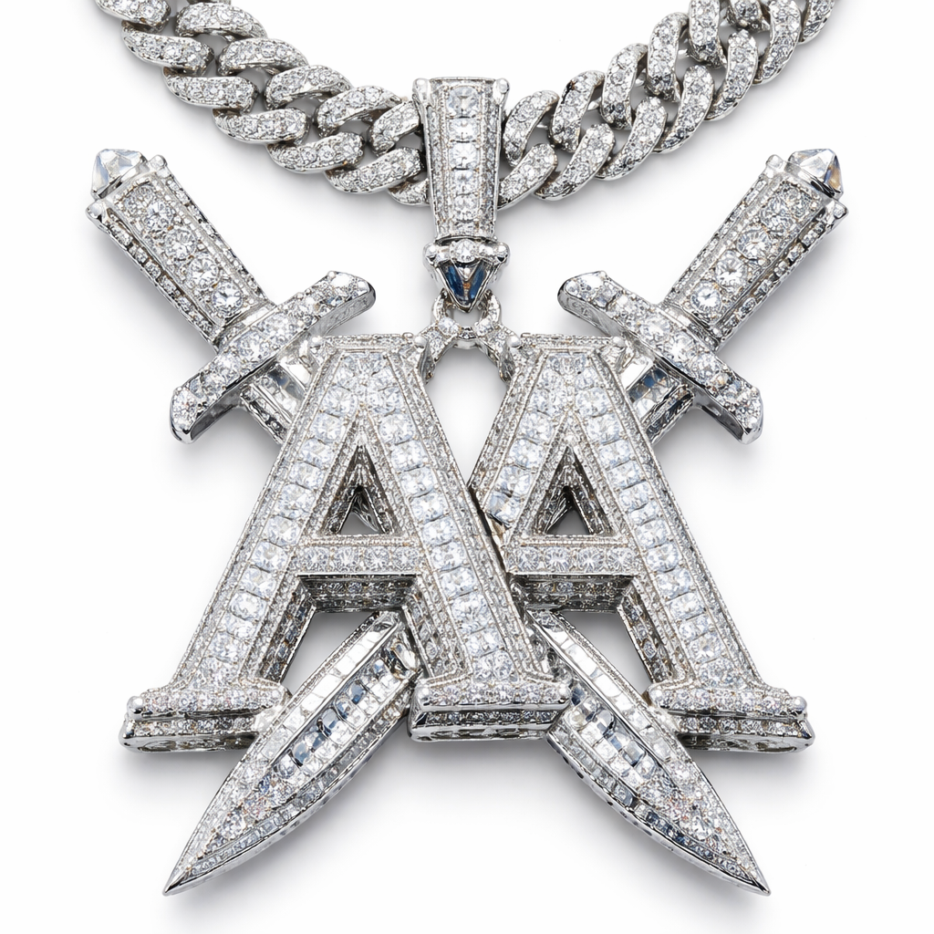 The style generally consists of thick, wide, 14k-18k white or rose gold Cuban links completely flooded with VVS natural diamonds. The pendant features a "one-of-a-kind" design with a mix of diamonds VVS and Baguette diamonds . It also features unique pyramid-cut jewels and an elevated structure. The Chain (Cuban Link): It is a custom, heavy-duty Cuban link chain made of white gold. The links are exceptionally large and entirely "iced out" (covered) with VVS diamonds.2 A’s With Crossed Swords But The 2 A’s Separate the 2 swords Are with the sword tip upwards but crossing URBAN STYLES