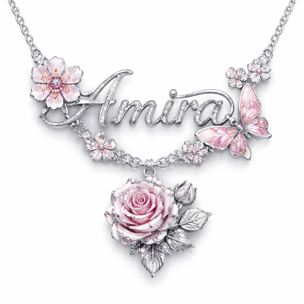 It begins with a cherry blossom, and with it is the name Amira. The last letter is a butterfly, and below it is a large rose with a smaller one. On the chain are some small flowers and other half-complete flowers, all in silver.