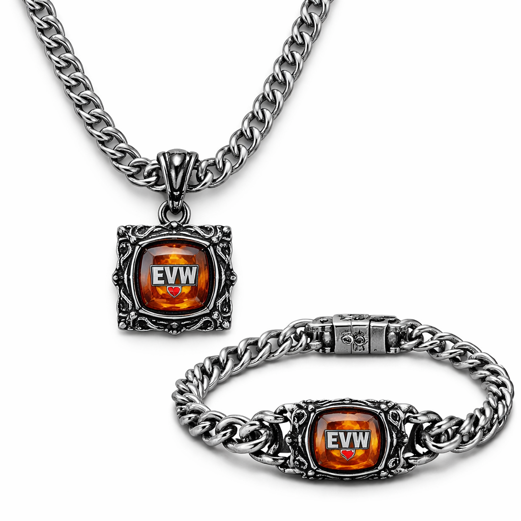 Steel nes Necklace and bracelet for man only amber stones small size EVW logo on the amber stone red and black and white colours , vintage style