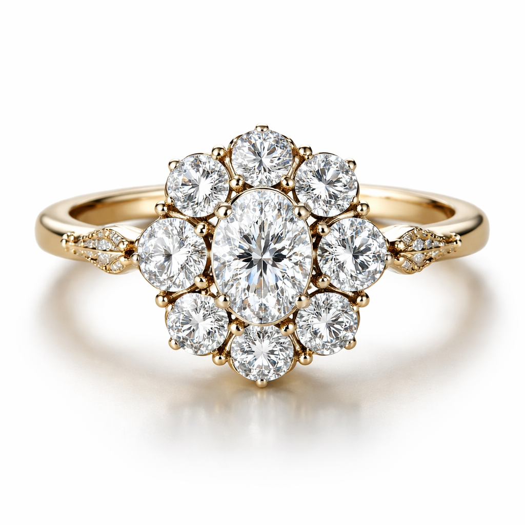 Create a flower style ring with the center stone being an oval three-quarter carat with large round stones, creating the look of a flower around the perimeter of the oval set the diamonds in platinum on a 14 yellow karat gold band the Centerstone has to be an oval, not a round, please make the center stone, a three-quarter carat oval leave space between the large round diamonds that create the flower halo and do eight stones, even if there is some space between them