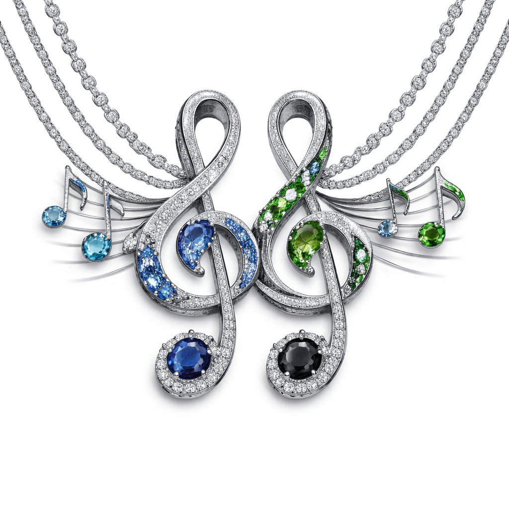 Take two music notes and combine them together the cleft notes combine them together. Give me notes on the side notes on the other side, music notes on each side with two cleft notes with their lower note heads connecting each lane on their back sideways right and left and then addtwo lines through the music notes leading from each cleft note from the letterhead upper letterhead put sapphire put green stone, put blue diamonds, white diamonds, black diamonds for the lower letterhead for each note and do three chains necklace chains linking from the front piece to around the neck, classic style