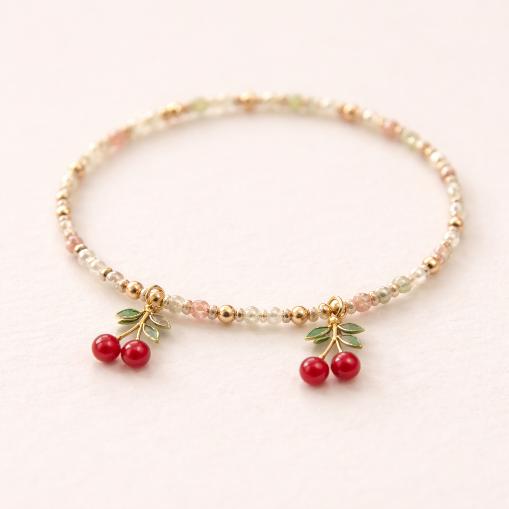 Bracelet with some small beads and little cherries charms, simple design, minimalist style