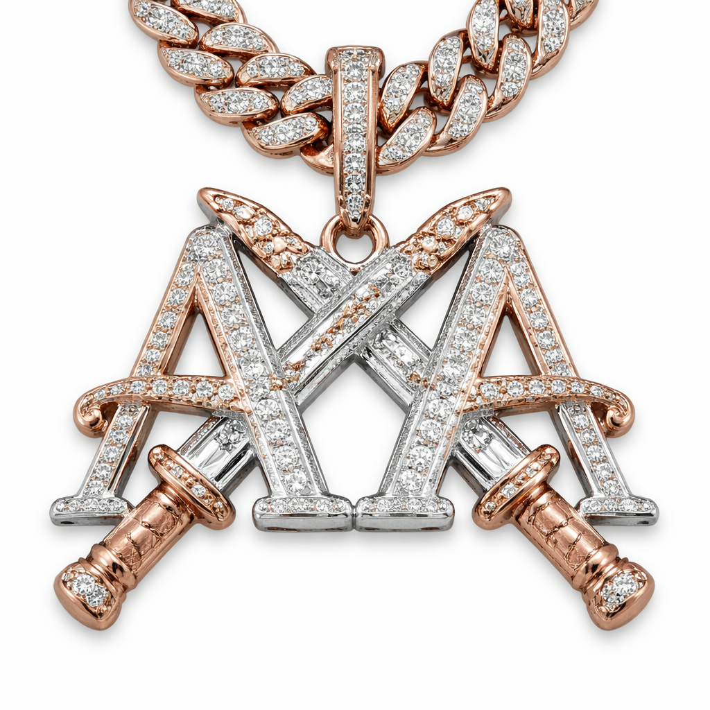 A Rose gold and white gold vvs cubanlink 20mm length pendant has 2 A’s With Twin Unique Crossed swords to separate the 2 A’s pendant is also Rose Gold And White Gold vvs Diamonds also with Baguette diamonds