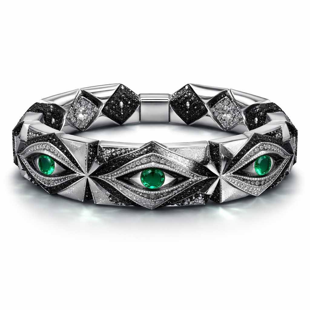 Geomatric sharp edges of architectural shapes and design of bracelet beads for men of white and ablack diamonds adding eye shape in abstract and artistically way with white background adding eye artistic shape l green light and dark