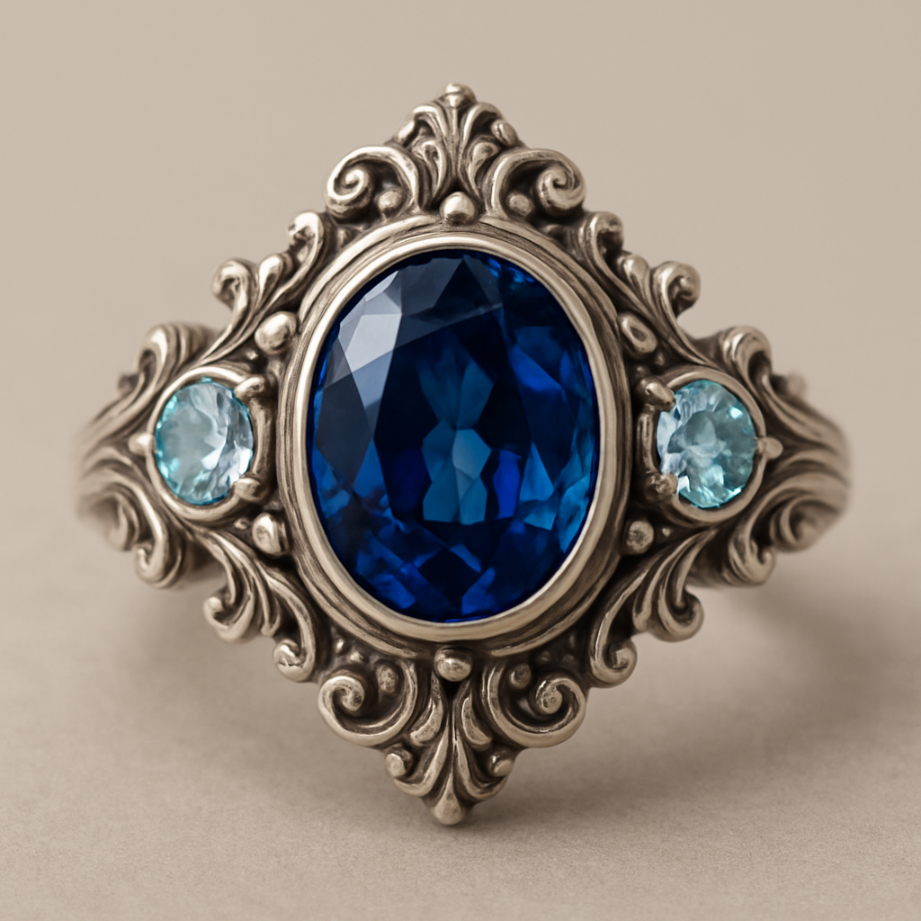 Oval sapphire silver ring with round aqua topaz accent stones , baroque style