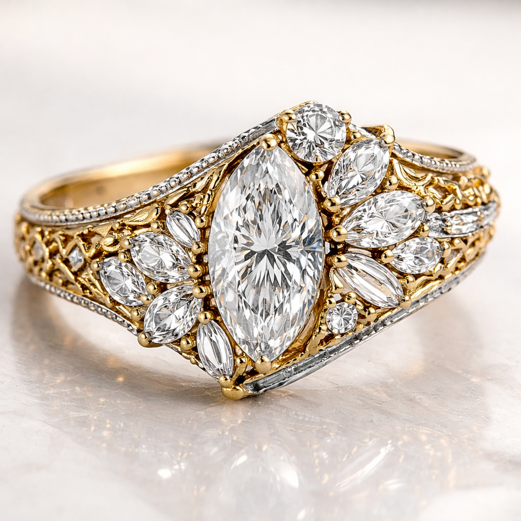 Asymmetrical diamond ring design with 1 .6 marquise , 1 .25 round , 6 smaller marquise, 2 .15 round and 4 .1 baguettes on a yellow gold band set in platinum , byzantine style