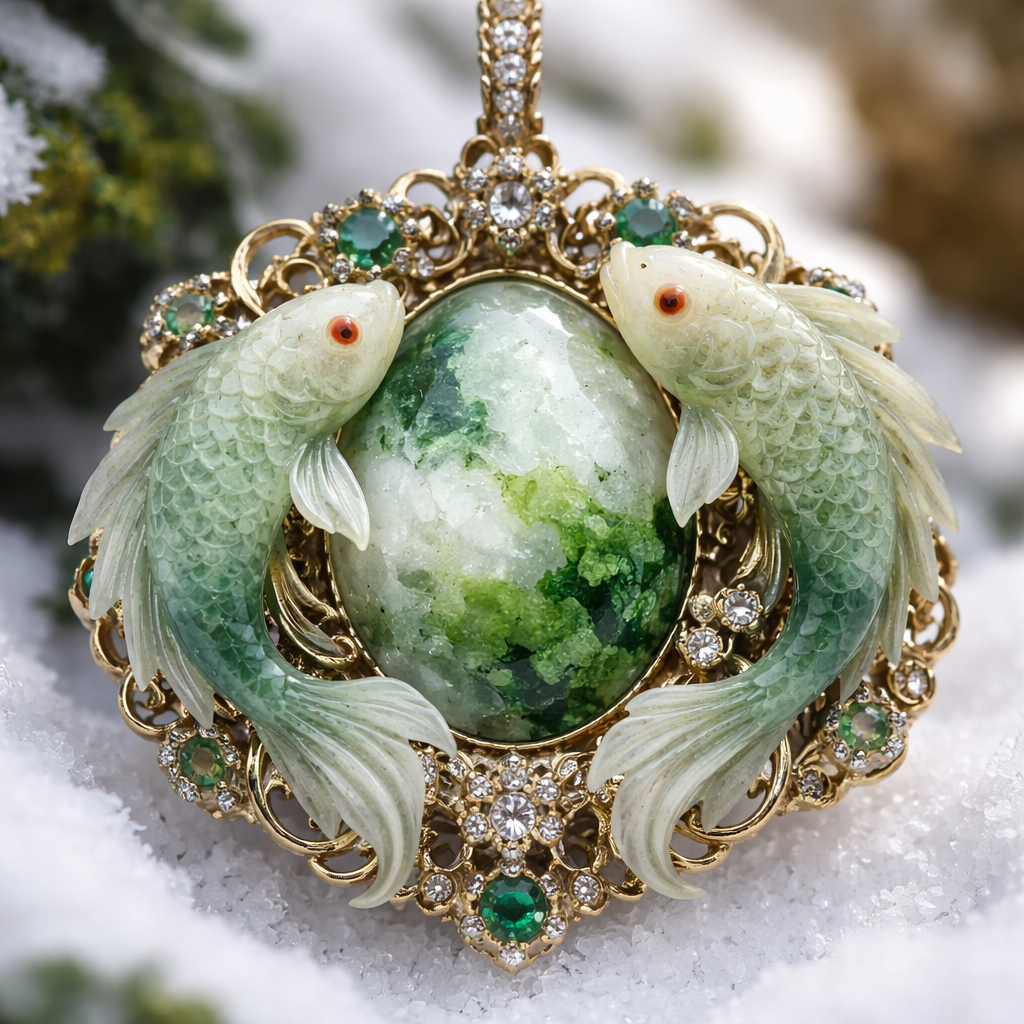 2 fishes jade with moss in the snow jade in the middle, vintage style